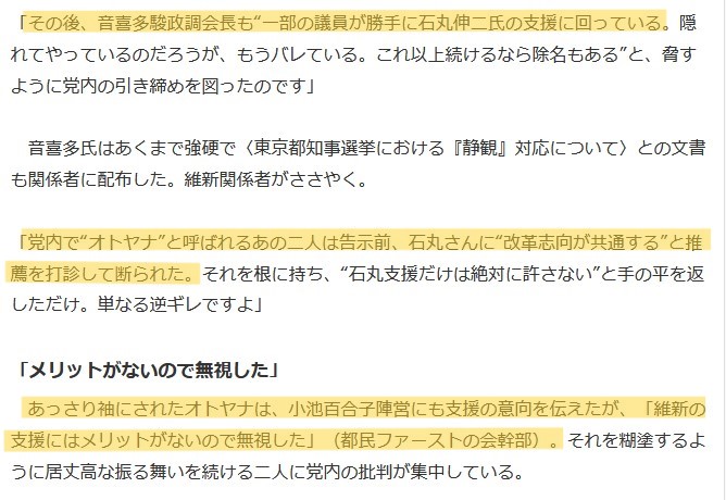 あっさり袖にされたオトヤナは、小池百合子陣営にも支援の意向を伝えたが、「維新の支援にはメリットがないので無視した」(都民ファーストの会幹部)。それを糊塗するように居丈高な振る舞いを続ける二人に党内の批判が集中している。