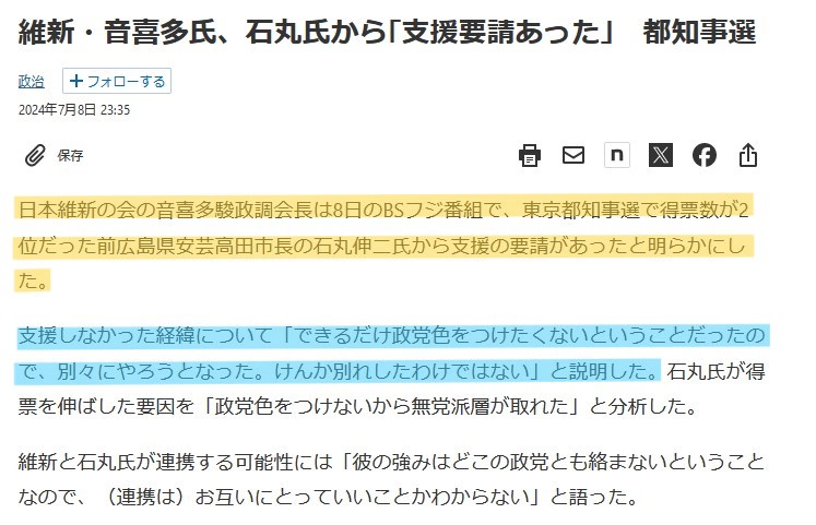 日本維新の会の音喜多駿政調会長は8日のBSフジ番組で、東京都知事選で得票数が2位だった前広島県安芸高田市長の石丸伸二氏から支援の要請があったと明らかにした。