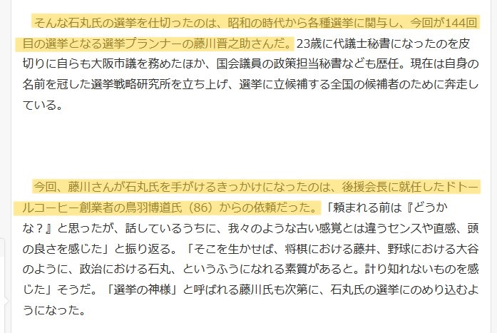 今回、藤川さんが石丸氏を手がけるきっかけになったのは、後援会長に就任したドトールコーヒー創業者の鳥羽博道氏(86)からの依頼だった。