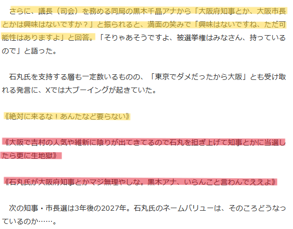 《石丸氏が大阪府知事とかマジ無理やしな。黒木アナ、いらんこと言わんでええよ》