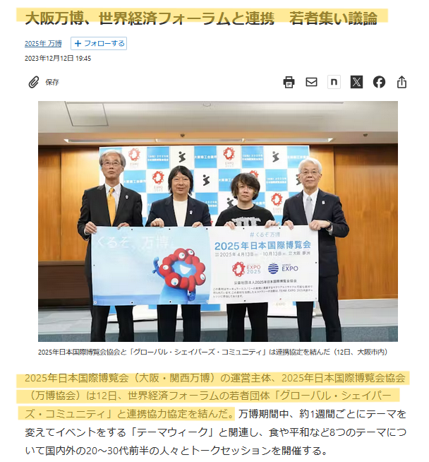 2025年日本国際博覧会(大阪・関西万博)の運営主体、2025年日本国際博覧会協会(万博協会)は12日、世界経済フォーラムの若者団体「グローバル・シェイパーズ・コミュニティ」と連携協力協定を結んだ。