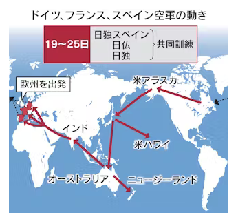 航空自衛隊とドイツ、フランス、スペイン空軍による共同訓練が19日、日本の周辺空域で始まる。各国の主力戦闘機が参加して部隊間の連携を確認する。欧州の国によるインド太平洋地域への部隊の派遣は増える傾向にあり、中国・ロシアへの抑止力を高める狙いがある。