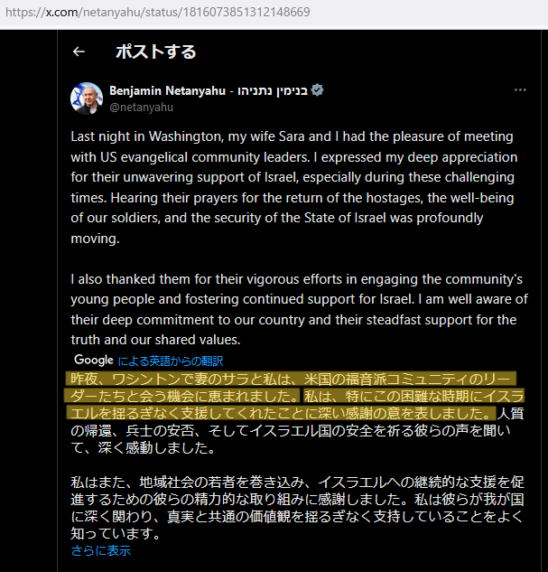 米国福音派コミュニティーはイスラエルを支持してくれる byネタニヤフ