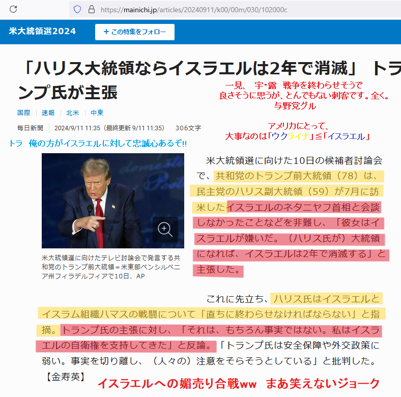「ハリス大統領ならイスラエルは2年で消滅」 トランプ氏が主張 2024/9/11 11:35(最終更新 9/11 11:35)