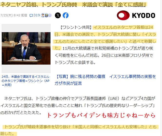 ネタニヤフ首相、トランプ氏称賛 米議会で演説「全てに感謝」