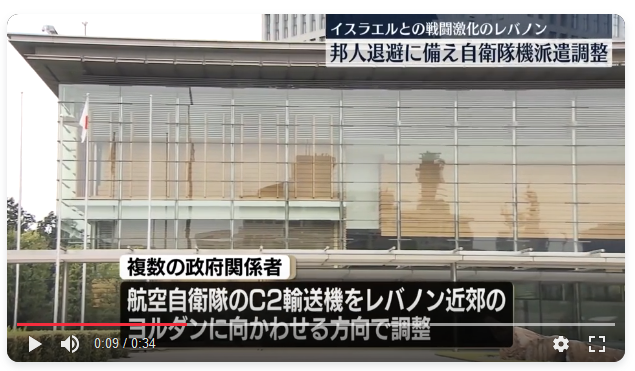 政府、自衛隊機派遣で調整 イスラエルとヒズボラの戦闘激化で日本人退避 9/26(木) 19:23配信