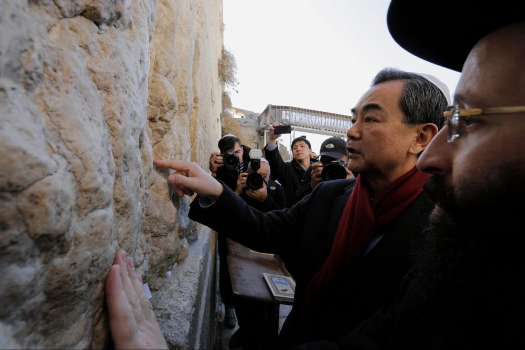 This probably won’t happen again. File photo: Chinese Foreign Minister Wang Yi stands next to Rabbi Shmuel Rabinovitch as he touches the stones of the Western Wall, Judaism’s holiest prayer site, during his visit to Jerusalem, December 20, 2013. REUTERS/Ammar Awad.
